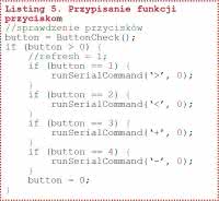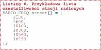 Dzięki modyfikacjom po przyciśnięciu któregoś przycisku program wykona funkcje jak gdyby otrzymał komendę z terminala runSerialCommand(). W tym przypadku przyciski powodują zwiększenie/zmniejszenie głośności oraz przełączenie na kolejną/poprzednią stacje z listy. Warto jeszcze uzupełnić listę stacji wpisując wartości częstotliwości ulubionych stacji (listing 6).