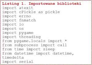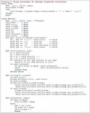 Na początek kodu importowane są biblioteki (listing 1). Najbardziej pomocna jest biblioteka pygame, która pozwała w łatwy sposób obsłużyć wyświetlacz oraz wyjścia i wejście audio. Definiowana jest klasa Icon (listing 2), która pozwala ładować pliki PNG jako obrazy z katalogu z ikonami.