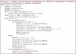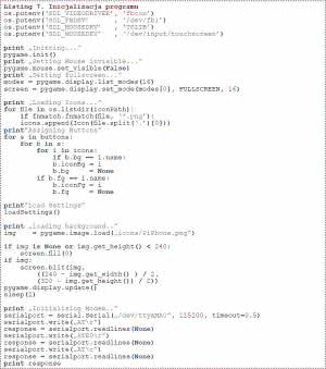 W ramach inicjalizacji programu (listing 7) skrypt konfiguruje zmienne środowiskowe dla ekranu dotykowego, a następnie uruchamia bibliotekę pygame. W następnej części ładuje ikony przycisków, wypełniając zadeklarowaną wcześniej globalną tablicę. Ładuje też dodatkowe ustawienia i tło wyświetlacza, a następnie inicjalizuje modem GSM. W tym celu również korzysta z poleceń AT przesyłanych przez port szeregowy.