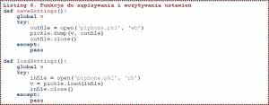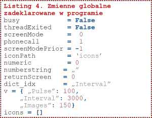 Autor przygotował zestaw zmiennych globalnych (listing 4), do których odnoszą się poszczególne funkcje. Zmienne te przechowują m.in. informacje o tym, czy prowadzona jest aktualnie rozmowa, który katalog zawiera ikony przycisków oraz który przycisk został ostatni naciśnięty. Jako zmienne globalne zadeklarowano także tablicę ikon i przycisków (listing 5), tworzoną w oparciu o podane wcześniej klasy. Na listingu 6 można zobaczyć funkcje służące do zapamiętywania i odczytywania ustawień.
