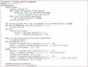Główna pętla programu (listing 8) nie jest długa. Przegląda ona stale listę zdarzeń zarejestrowanych za pomocą biblioteki pygame i jeśli znajdzie na niej zdarzenie typu MOUSEBUTTONDOWN, sprawdza dla każdego przycisku, czy obszar zdarzenia (pozycja kursora) nie leży czasem w zasięgu danego przycisku.