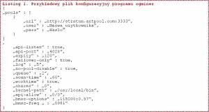 Dla ułatwienia, zbiór ustawień (parametrów wywołania) można zapisać w pliku konfiguracyjnym, a następnie wywołać program cgminer z parametrem --config adres_ pliku_konfiguracyjnego. Przykładowy plik pokazano na listingu 1.