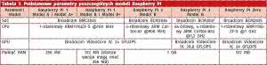 Najnowsze Raspberry PI 3 poszło o krok dalej - zastosowany układ to 64-bitowy Broadcom BCM2837, z czterema rdzeniami Cortex-A53, taktowanymi zegarem 1,2 GHz. Można też wspomnieć o module Raspberry PI Zero, z układem takim jak w Raspberry PI 1, ale szybszym, bo taktowanym zegarem 1 GHz (tabela 1).