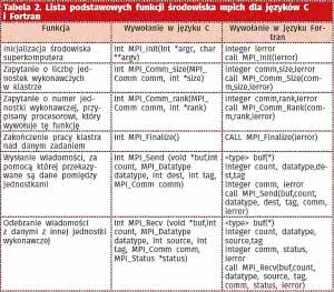 W przypadku środowiska mpich, w języku C do podziału i przekazywania danych wykorzystywana jest biblioteka mpi.h. Pozwala ona m.in. wewnątrz programu, dowiedzieć się, ile jest jednostek wykonawczych w klastrze, jaki jest numer danej jednostki, która aktualnie przetwarza przygotowany kod oraz wysyłać dane do innych jednostek. Lista podstawowych funkcji dla języków C i Fortran została zebrana w tabeli 2.
