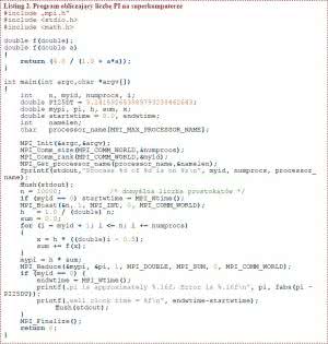 Po pobraniu i rozpakowaniu go (komendy wget oraz tar -xzf) w katalogu mpich-3.1/ examples/ będzie można znaleźć kody źródłowe różnych przykładowych programów. Jednym z nich jest program cpi, służący do obliczania liczby pi (jego kod źródłowy został pokazany na listingu 2). Na potrzeby uwypuklenia zalet superkomputera, edytowaliśmy go, by zmienić dokładność jego pracy, podmieniając wartość n=10000 na n=1000000.