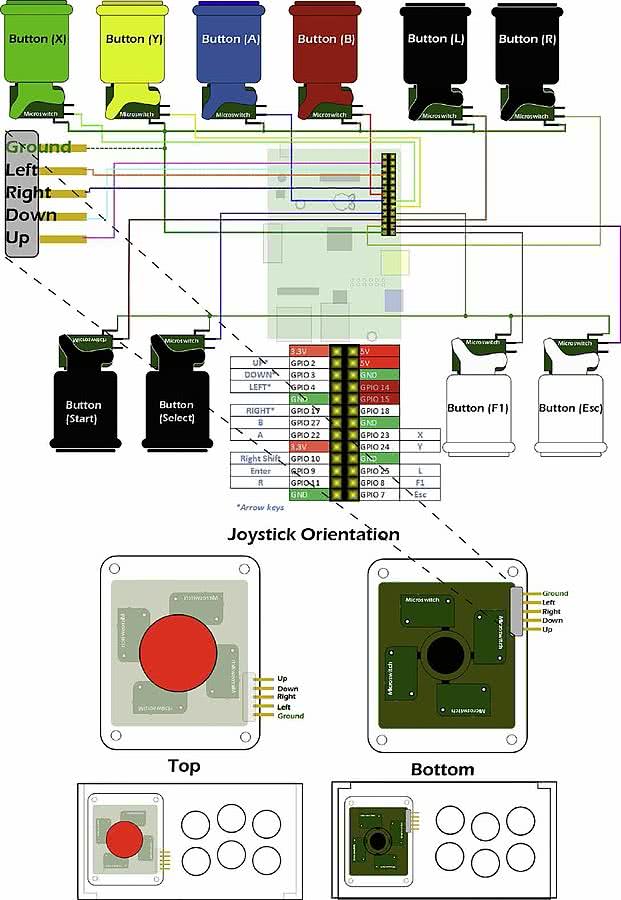 Joystick i przyciski należy podłączyć do odpowiednich wyprowadzeń GPIO Raspberry PI. W praktyce klawisz A jest w większości gier używany jako podstawowy klawisz akcji, a B, jako klawisz cofnięcia lub drugi klawisz akcji. Jeśli gra tego wymaga, jako przycisk startu podłączany jest klawisz przypisany w konfiguracji do klawiaturowego ENTERu, a jako przycisk wyboru - prawy shift.