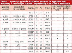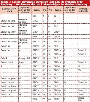 W nowych Raspberry PI z większą liczbą wyprowadzeń można podłączyć nawet 23 przyciski, które standardowo predefiniowane są do obsługi przez dwóch graczy (tabela 3). W praktyce, w Porta PI Arcade, znaczenie klawiszy podpiętych do poszczególnych linii GPIO jest zdefiniowane w pliku retrogame.c, który znajduje się w podkatalogu Retrogame, w katalogu domowym użytkownika pi.