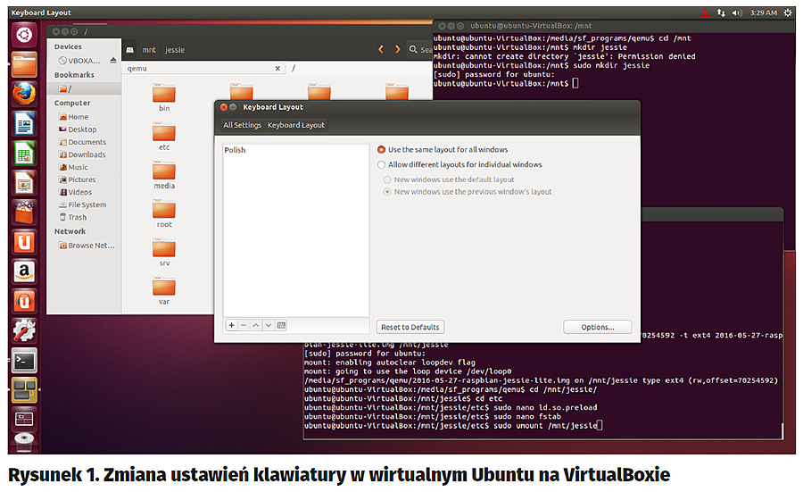 W tym momencie warto dla pewności zrestartować system wirtualny, po czym konieczne staje się dodanie aktualnego użytkownika (ubuntu) do grupy vboxsf, by mieć dostęp do folderu współdzielonego z rzeczywistego komputera, w którym znajduje się obraz Raspbiana Jessie. W tym celu należy w terminalu maszyny wirtualnej Ubuntu wykonać polecenie: