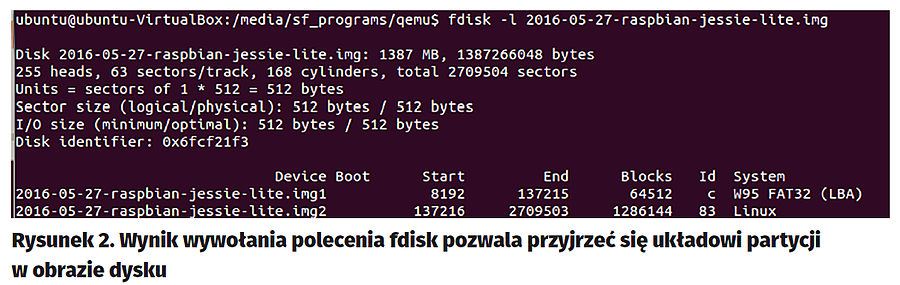 W przypadku Raspbiana Jessie Lite z 27 maja 2016 wygląda ona tak, jak na rysunku 2. Jak widać, plik zawiera dwie partycje, z czego druga (2016-05-27-raspbian-jessie-lite.img2) rozpoczyna się od sektora 137216. W przypadku innych obrazów wartość ta będzie się nieco różnić. Natomiast wielkość sektora to 512 bajtów. Oznacza to, że druga partycja rozpoczyna się od 70254592 bajtu (137216×512). Mając tę informację, możemy ją podmontować, pomimo że znajduje się wewnątrz pliku obrazu. Należy użyć polecenia mount z uprawnieniami roota:
