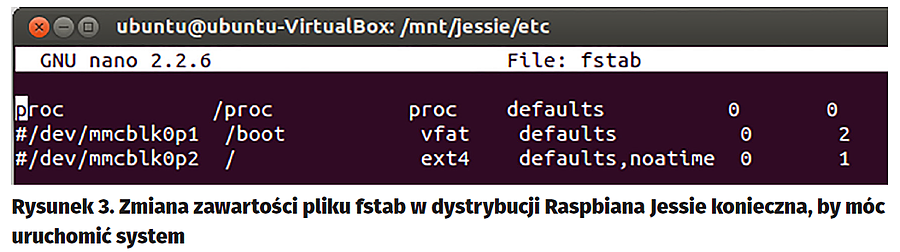 w którym należy wykomentować wszystkie linie, zawierające ciąg o fragmencie „mmcblk” (rysunek 3). Chodzi o to, by system nie wieszał się w momencie próby podmontowania zawartości karty pamięci, gdyż w systemie jest ona widziana jako pendrive. Po zapisaniu zmian należy wyjść z podmontowanych podkatalogów np. poprzez: