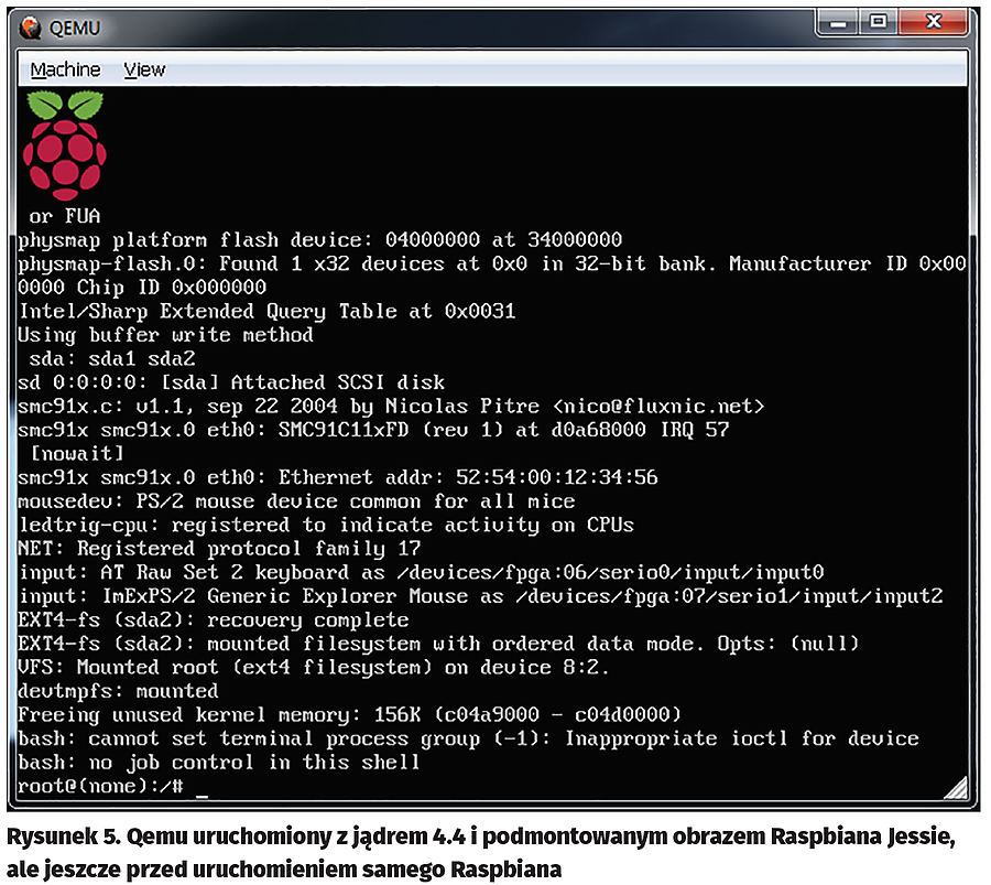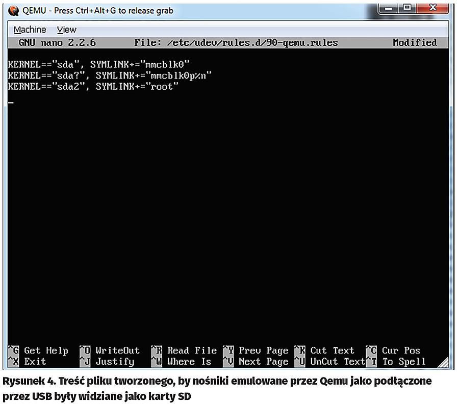 System powinien uruchomić się, pomimo wyświetlenia szeregu błędów. Istnieje też bardzo duża szansa, że zawartość pliku /etc/udev/rules.d/90-qemu.rules została wyczyszczona, stąd trzeba ją sprawdzić i ew. uzupełnić, tak jak na rysunku 4. Może się okazać, że tym razem wywołanie polecenia nano dla tego pliku będzie wymagało uprawnień roota (czyli wywołanie rozpoczynamy od sudo). Pojawia się tu pewne dodatkowe utrudnienie. Raspbian domyślnie uruchamia się z klawiaturą ustawioną na układ brytyjski, a więc inną niż w USA czy w Polsce. Cudzysłów potrzebny w modyfikowanym pliku 90-qemu.rules uzyskuje się na niej poprzez naciśnięcie SHIFT+2. Po zapisaniu zmian można ponownie wyłączyć system.