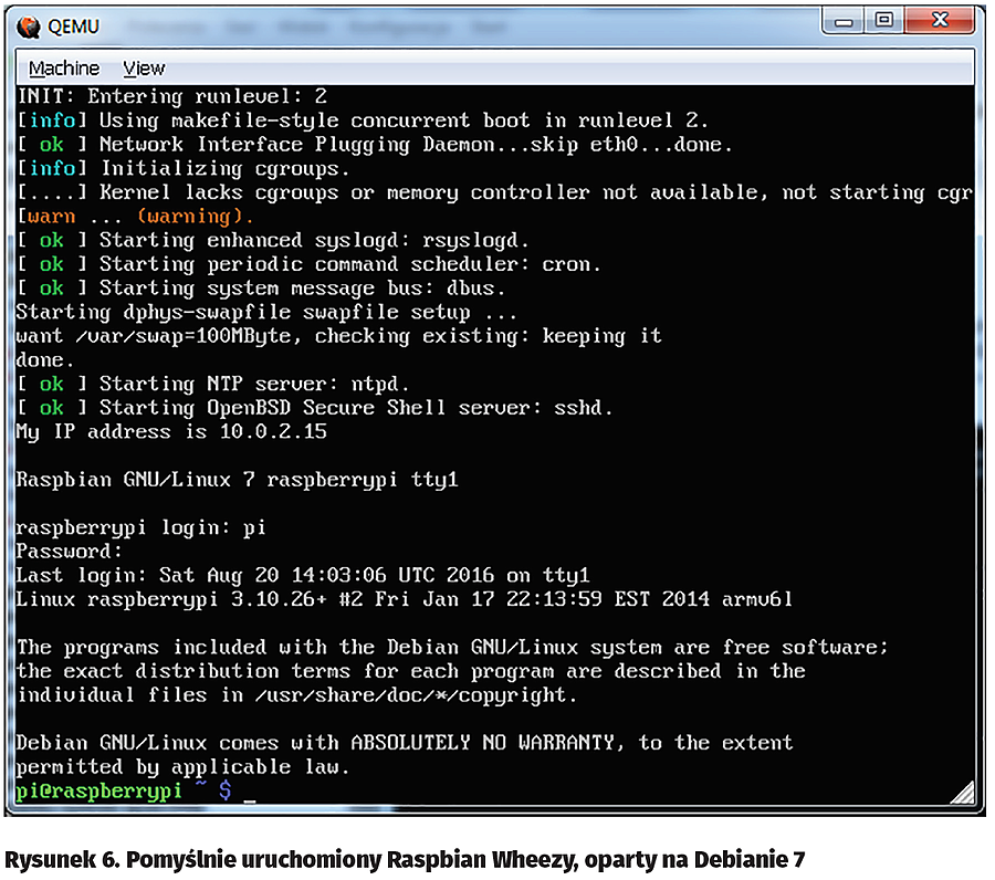 W efekcie na komputerze realnym mamy zmodyfikowany obraz Raspbiana Jessie, który nie będzie powodował problemów przy uruchamianiu w Qemu.