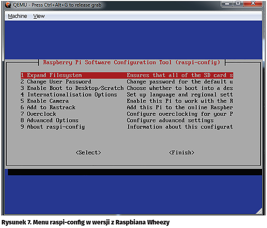 W tym momencie musimy zwrócić uwagę na jeden istotny szczegół, a mianowicie na dużą różnicę pomiędzy Raspbianem Jessie a poprzednią generacją tego systemu, czyli Raspbianem Wheezy. Ten starszy bazuje na zupełnie innej wersji jądra i jest znacznie mniej problematyczny do uruchomienia. Jeśli więc do zaplanowanych testów wystarczy starsza wersja systemu operacyjnego, można sięgnąć po Raspbiana Wheezy np. z 16 lutego 2015 r. i w ten sposób uniknąć kilku dodatkowych kroków. Dowolna wersja Raspbiana Jessie będzie natomiast wymagała dodatkowych modyfikacji. Opisujemy je poniżej.