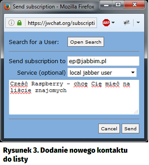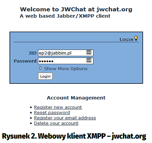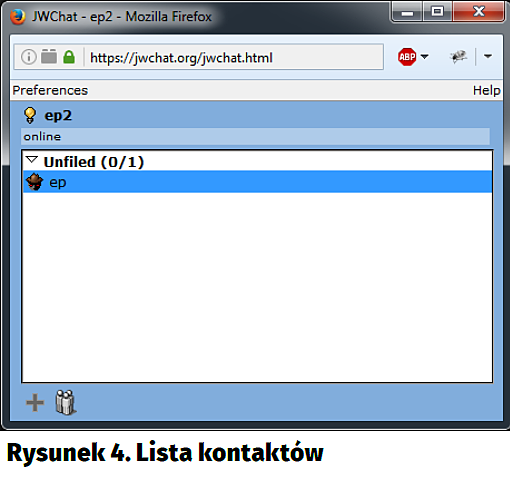 Teoretycznie już teraz można korzystać z usługi, ale warto chwilę poczekać – z naszych doświadczeń wynika, że serwer Jabbim.pl potrzebuje kilku minut, zanim „zorientuje się”, że ma nowego użytkownika. Samo wysłanie wiadomości wymaga przekazania na wejście programu sendxmpp przesyłanej treści oraz wskazania nazwy adresata. Przykładowo w ten sposób echo „To jest wiadomość z Raspberry Pi” | sendxmpp -t ep2@jabbim.pl. Jeśli na razie nie chcemy instalować żadnego specjalnego komunikatora, albo użyć dotychczasowych kont na potrzeby testów, możemy użyć darmowego, webowego klienta XMPP – np. jwchat.org (rysunek 2). Wystarczy wejść przeglądarką na stronę jwchat.org i zalogować się za pomocą danych podanych w jabbimie. My zalogowaliśmy się za pomocą drugiego z utworzonych kont.