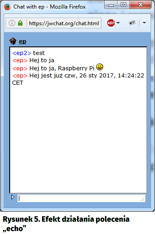 Powłoka bash z Raspbiana pozwala na tak wiele, że możemy już za samą jej pomocą, bez konieczności pisania dodatkowych programów, przesyłać dosyć duo informacji przez komunikator. Przykładowo w komendzie echo można wyświetlić wynik dowolnego polecenia systemowego. Jeśli chcemy przesłać z Raspberry Pi aktualną datę, możemy użyć polecenia echo „Jest już ” $(date) | sendxmpp -t ep2@jabbim.pl. Efekt widać na rysunku 5. To otwiera wiele możliwości. Jeśli np. mamy do Raspberry Pi dołączony czujnik temperatury, z którego wskazanie pobieramy poleceniem ~/temp, to wywołując echo „Aktualna temperatura w domu to: ” $(~/temp) | sendxmpp -t ep2@jabbim.pl, prześlemy ją do naszego klienta.