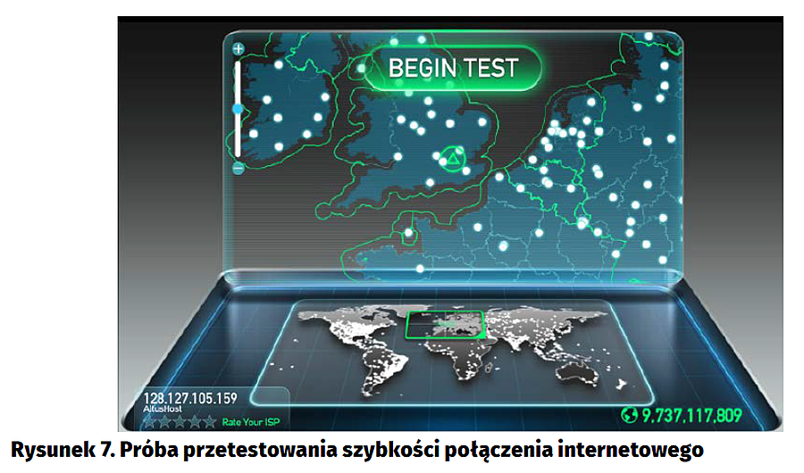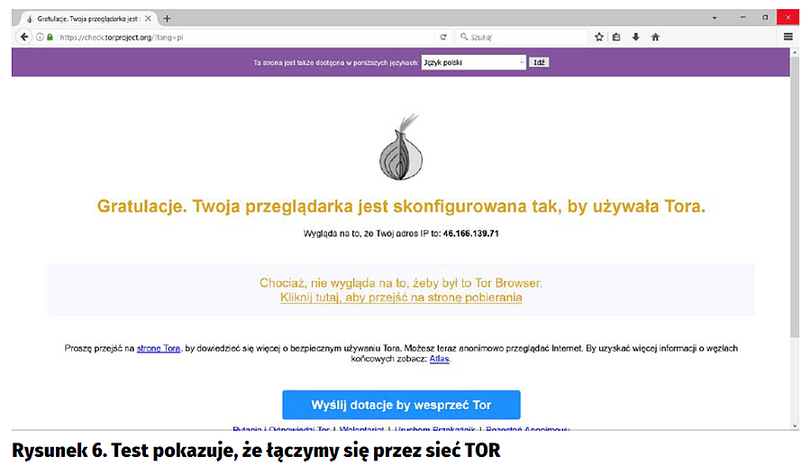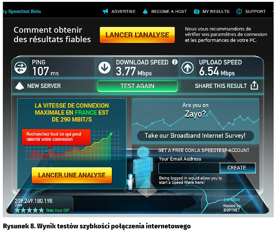 Z naszego doświadczenia wynika, że potrzeba kilku minut od uruchomienia routera do momentu, aż zacznie on w sprawnie przekazywać ruch przez sieć TOR. Niemniej wszelkie podłączone komputery były widziane, jakby przeglądały Internet zza TORa. Można to sprawdzić na kilka sposobów. Pierwszy to wejście na stronę https://check.torproject.org. Rezultat podczas korzystania z przygotowanego przez nas hotspotu widać na rysunku. Można też pokusić się o przetestowanie szybkości łącza. W naszym przypadku serwis Speedtest.net uznał, że łączymy się z Wielkiej Brytanii (rysunek 7), a uzyskane wyniki pomiarów (rysunek 8) zaprezentowano nam z francuskojęzycznymi reklamami.