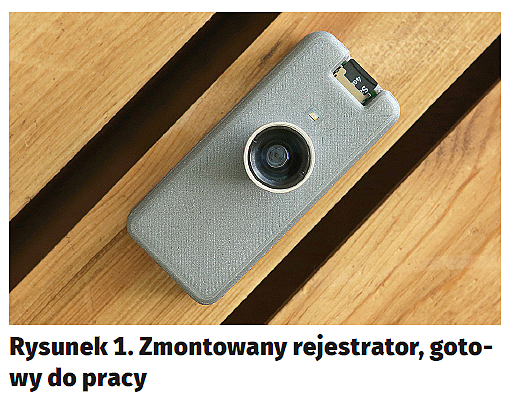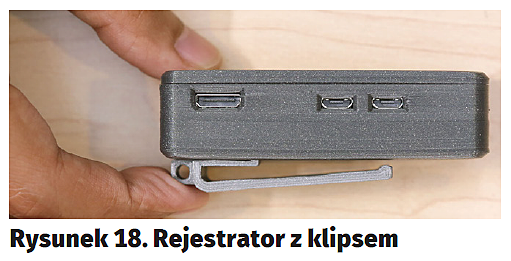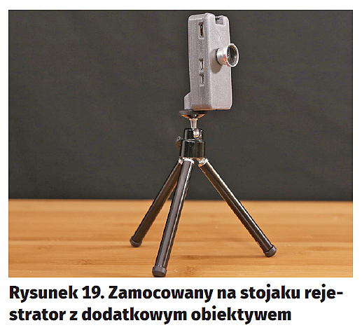 Zaprezentowany projekt jest nie tylko estetyczny, ale i praktyczny – może być faktycznie użyteczny. Stanowią też dobrą okazję do wypróbowania możliwości druku 3D. Opcjonalnie rejestrator można doposażyć w zewnętrzny obiektyw, taki jak do telefonów komórkowych i mocowany magnetycznie (rysunek19). Całość projektu można obejrzeć pod adresem https://goo.gl/QSiE5W.