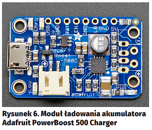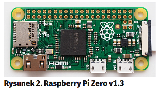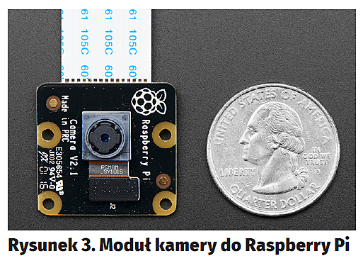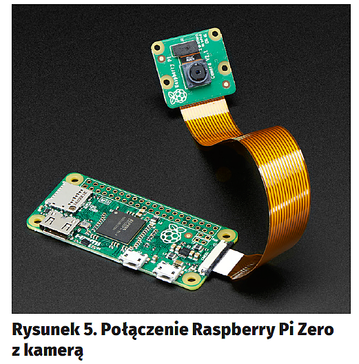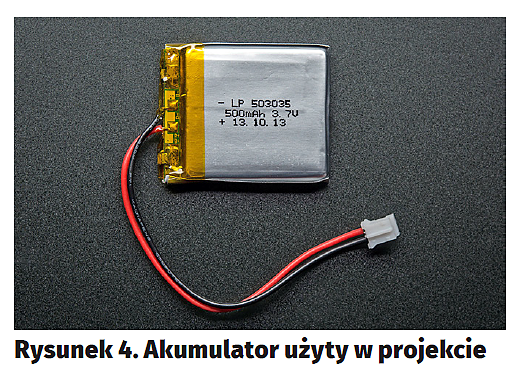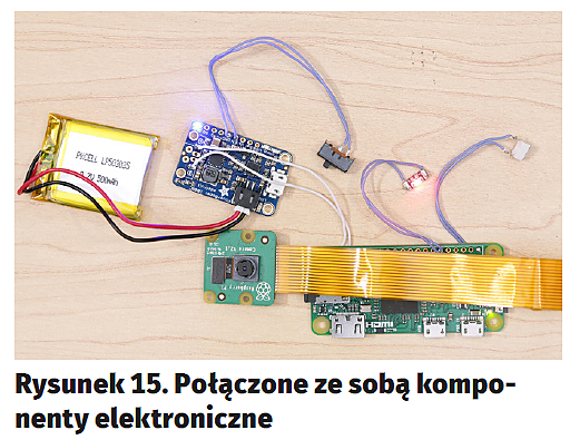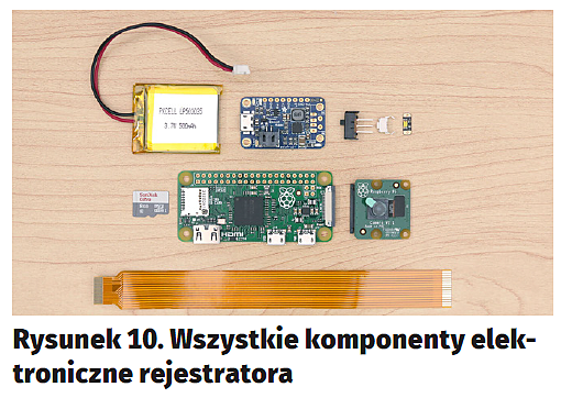 Podstawowe komponenty użyte w projekcie to Raspberry Pi Model Zero w wersji 1.3 (rysunek2), Raspberry Pi Camera w 8-megapikselowej wersji V2 (rysunek3) oraz polimerowy akumulator litowo-jonowy o pojemności 500 mAh (rysunek4). Zarówno Raspberry Pi, jak i moduł kamery można swobodnie zastąpić inną wersją – choćby klasycznym, dużym RPI, a kamerę starszym modelem, bądź nawet wersją na podczerwień. Użyte podzespoły i napisane oprogramowanie są na tyle uniwersalne, że będą działać z każdym z tych komponentów.