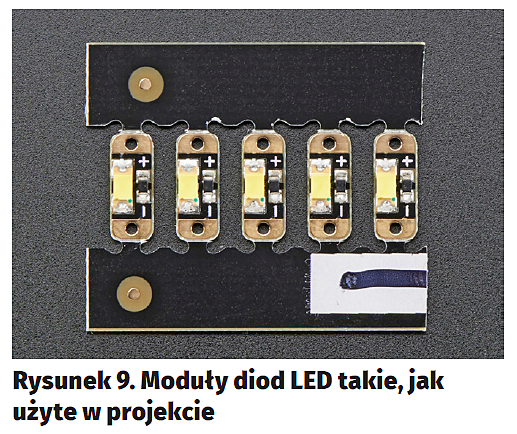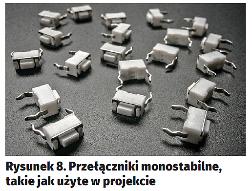 Moduł kamery został podłączony do Raspberry Pi za pomocą adekwatnej taśmy (rysunek5), takiej jak dostępna pod adresem https://goo.gl/D9Zgr7. Użyto karty pamięci 4 GB, ale jeśli chce się zapisywać bardzo dużo zdjęć, warto sięgnąć po większą pamięć. Sekcję zasilania wzbogacono o moduł ładowarki (rysunek6), który umożliwia jednoczesne ładowanie akumulatora i zasilanie komputera. Jest on dosyć drogi, gdyż kosztuje 15 dolarów (https://goo.gl/b4o27h), stąd znacznie podnosi cenę projektu. Zamiast tego można po prostu bezpośrednio podłączyć napięcie 5 V z zasilacza, lub użyć prostszej ładowarki. Pozostałe komponenty to przełącznik suwakowy (rysunek7), przełącznik przyciskany monostabilny (rysunek8) i dioda LED z rezystorem 100 V w postaci gotowego moduliku (rysunek9). Wszystkie komponenty zebrano na rysunku10.