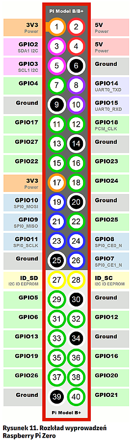 Połączenia pomiędzy podzespołami są bardzo proste. Kamerę należy podłączyć tasiemką do złącza na Raspberry Pi. Układ zasilania (wyprowadzenia + i –) należy podłączyć do pinów zasilania 5 V i masy w Raspberry Pi. Diodę LED z szeregowo podłączonym rezystorem należy wpiąć pomiędzy piny GPIO5 i masę. Przycisk monostabilny pomiędzy piny GPIO21 i masę. Posłuży do bezpiecznego wyłączania rejestratora. Wyprowadzenie akumulatora trzeba podpiąć do jedynego pasującego złącza na płytce PowerBoost. Przełącznik monostabilny podłączamy pomiędzy wejście EN a masę układu PowerBoost, dzięki czemu będzie służyć jako włącznik całego rejestratora. Układ wyprowadzeń Raspberry Pi Zero pokazano na rysunku11.