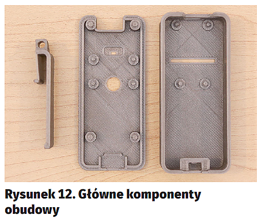 Wielką zaletą opisywanego projektu jest dobrze dopasowana obudowa mechaniczna. Składa się ona z trzech podstawowych części, które można wydrukować nawet na niewielkiej drukarce 3D (rysunek12). Wierzchnią i spodnią część obudowy uzupełnia klips, który pozwala zamontować kamerę np. na pasku. Ma on też otwór, dzięki któremu cały rejestrator można zawiesić na cienkiej lince.