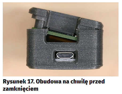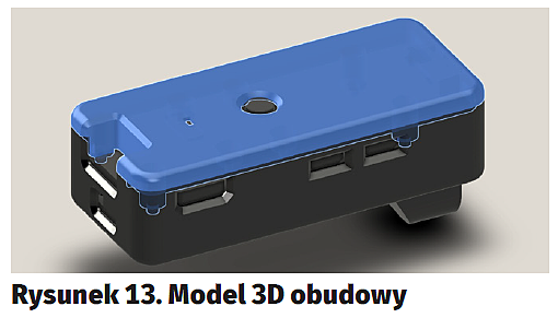 Projekt obudowy można bezpłatnie pobrać z repozytorium Thingiverse (https://goo.gl/Ur8jNp). Wizualizację modelu pokazano na rysunku 13. Wśród plików 3D jest także fragment do zamontowania statywu. Pliki są w formacie STL, a więc osoby umiejące projektować mogą sobie swobodnie zmodyfikować obudowę tak, by pasowała do innych podzespołów, w tym np. do większego akumulatora. Ci czytelnicy, którzy nie mają takich zdolności, a chcieliby użyć nieco innych podzespołów będą w gorszej sytuacji, ale w praktyce większość modyfikacji będzie polegała na rezygnacji np. z modułu PowerBoost, po którym wolną przestrzeń można po prostu zapchać klejem termicznym. Zresztą twórcy i tak wykorzystali klej w swoim projekcie.