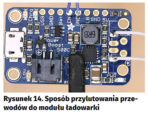 Przełącznik przesuwany należy pozbawić jednego z bocznych wyprowadzeń, a pozostałe dwa przylutować do cienkich przewodów. Moduł LED należy również podłączyć do dwóch przewodów, a jeśli stosujemy oddzielną diodę zamiast modułu, najlepiej rezystor dolutować tak by rezystor można było swobodnie ułożyć w obudowie. Przycisk monostabilny też lutujemy do dwóch cienkich przewodów. Przewody od przełącznika bistabilnego montujemy do przelotek EN i GND na module ładowarki (rysunek14). Wyprowadzenia ładowarki łączymy przewodami z Raspberry Pi Zero – najlepiej od spodu. Następnie, również od spodu lutujemy wyprowadzenia diody LED z opornikiem. Kolejny krok to podłączenie taśmą kamery z komputerem i podczepienie akumulatora w gniazdo na module zasilania. Przycisku monostabilnego nie należy na tym etapie trwale lutować do Raspberry Pi ze względu na konstrukcję obudowy. Całość po wykonaniu połączeń elektrycznych powinna wyglądać tak, jak na rysunku15.