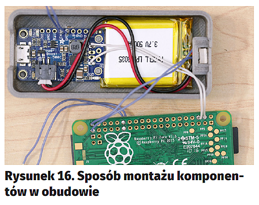 Zlutowane ze sobą elementy można umieszczać w obudowie, ale najlepiej zacząć od przycisku monostabilnego, którego wyprowadzenia należy przeciągnąć przez otwór w jej spodzie i następnie już na stałe przylutować do Raspberry Pi. W drugiej kolejności wypada zamontować przetwornicę (tak by weszła na wypustki w obudowie) i umieścić obok niej akumulator. Jeśli elementy obudowy nie są idealnie spasowane po druku 3D, można użyć kleju by podzespoły nie poruszały się luźno. Diodę LED należy przymontować do otworu we froncie obudowy. Jeśli użyto innej niż w oryginalnym projekcie, prawdopodobnie będzie konieczne jej przyklejenie. Ważny krok to odpowiednie wypozycjonowanie moduły kamery. Tu również projektanci obudowy przygotowali odpowiednie wypustki, które pozwalają na sztywne uchwycenie kamery (rysunek16).