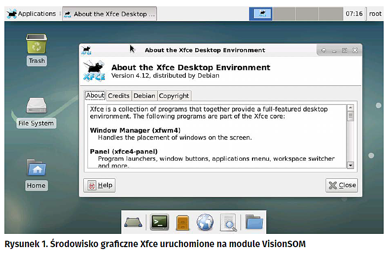 W konfiguracji domyślnej dostarczony przez producenta modułu obraz z dystrybucją Debian, nie ma zainstalowanego środowiska graficznego. Dzięki wykorzystaniu wbudowanego w system menedżera pakietów instalacja wybranego środowiska ogranicza się do dwóch prostych poleceń w konsoli systemu (w odróżnieniu od np. Buildroota, gdzie wymagana byłaby rekonfiguracja i ponowne przebudowanie obrazu systemu). Instalowanie „lekkiego” środowiska graficznego Xfce [5]: