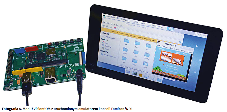 Do budowy emulatora konsoli Famicon/NES wykorzystamy moduł komputera VisionSOM wyposażony w gniazdo karty pamięci SD, więc projekt rozpoczynamy od przygotowania karty z systemem operacyjnym Linux. Producent komputera – firma SoMLabs na stronach Wiki swojego produktu [3] dostarcza użytkownikowi wsparcie w postaci gotowych obrazów z dystrybucją Debian oraz opisem budowy obrazów z wykorzystaniem takich narzędzi jak Buildroot oraz Yocto. Przy wstępnym wyborze odpowiedniej dystrybucji lub narzędzi do budowy obrazu pomocne jest jasne określenie celu projektu. Jeżeli finalnym celem projektu jest zbudowanie jak najwierniejszej kopii samej konsoli (z minimalnym obrazem systemu, wyposażonym wyłącznie w niezbędne oprogramowanie umożliwiające uruchomienie emulatora bezpośrednio po starcie urządzenia), wówczas zalecaną opcją jest wykorzystanie narzędzia Buildroot. Jeśli natomiast chcemy osiągnąć docelowy efekt jak najmniejszym nakładem pracy, a sam komputer jednopłytkowy ma pełnić również inne funkcje (np. korzystamy z pełnego środowiska graficznego, a emulacja konsoli NES jest wyłącznie dodatkową opcją), warto skorzystać z gotowych pakietów środowiska Debian – pozwoli to uniknąć m.in. samodzielnej kompilacji oprogramowania emulatora. W niniejszym artykule wykorzystano drogę na skróty i użyto gotowych obrazów z dystrybucją Debian (autor na własnym przykładzie przekonał się, że wybór drugiej ścieżki jest bardziej optymalny – zaoszczędzony czas można wówczas poświęcić na testowanie projektu i radosny powrót do czasów dzieciństwa).