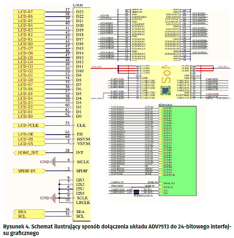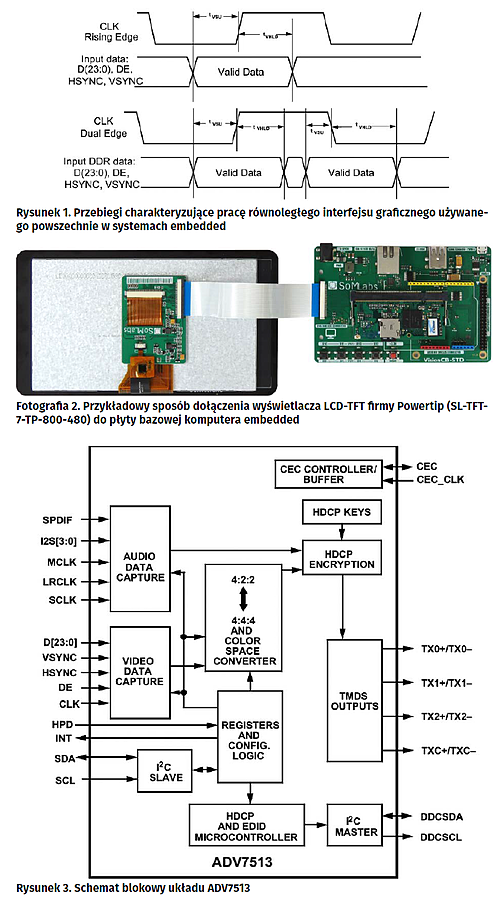 Informację o intensywności świecenia poszczególnych pikseli przesyłane są w takt linii CLK na zboczu narastającym oraz opadającym (DDR). Dodatkowo linie HSYNC oraz VSYNC informują o początku nowej linii oraz początku nowej ramki obrazu. Konwersję sygnału RGB na sygnał HDMI umożliwiają wyspecjalizowane nadajniki HDMI, których bardzo popularnym przedstawicielem jest układ ADV7513 produkowany przez Analog Devices (rysunek 3).