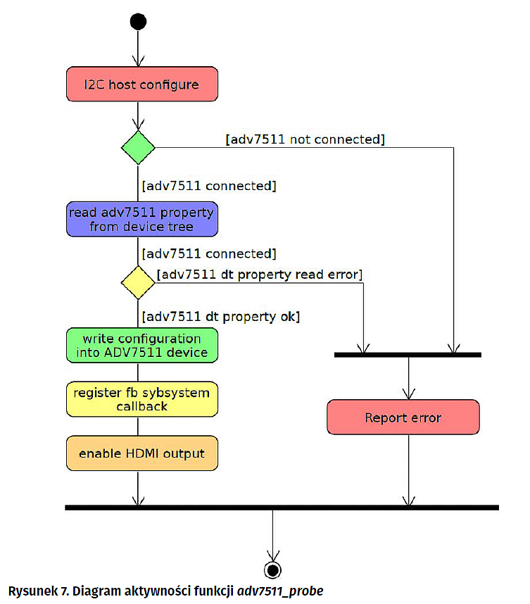 Sterownik rozpoczyna działanie od wywołania funkcji adv7511_probe, która jest wywołana przez podsystem sterowników jądra w momencie odczytania obecności wpisu odnoszącego się ADV7513 w Device Tree. Diagram aktywności dla wspomnianej funkcji przedstawiono na rysunku 7.