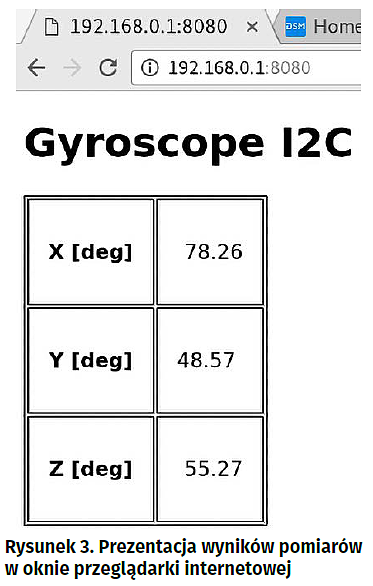 Po ponownym uruchomieniu serwera oraz odświeżeniu zawartości strony internetowej, generowane przez aplikację gyro-i2c, losowe wyniki pomiarów powinny zostać wyświetlone i na bieżąco aktualizowane – rysunek 3.