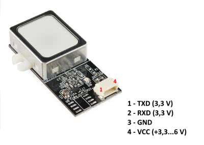 Moduł GT-511 to niewielka płytka o wymiarach – wraz z plastikowymi uchwytami mocującymi – 38 mm×25 mm×10 mm. Głównym elementem jest matowo-białe pole dotykowe, pod którym umieszczono podświetlenie i sensor optyczny. Poza tym, na płytce zmontowane jest miniaturowe gniazdo do doprowadzenia zasilania i sygnałów TxD i RxD portu szeregowego do komunikacji z modułem. Na dolnej stronie zamontowano układy elektroniczne i większość elementów dyskretnych. Dioda LED sygnalizująca podłączenie zasilania zamontowano na górze płytki, po tej samej stronie, co sensor i gniazdo. Wygląd modułu i rozmieszczenie wyprowadzeń w gnieździe pokazano na rysunku 1.