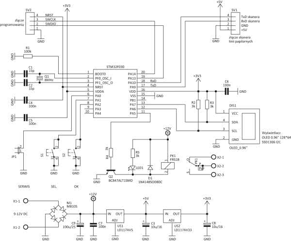 Schemat proponowanego rozwiązania sterownika współpracującego z modułem pokazano na rysunku 2. Jako element sterujący wykorzystany został jeden z najmniejszych kontrolerów firmy ST o oznaczeniu STM32F030. Układ dysponuje 16 kB pamięci Flash i 2 kB pamięci RAM. Jest dostępny w miniaturowej, dwurzędowej obudowie typu TSSOP20. Do portów PA9, PA10 kontrolera, dołączone są linie RxD, TxD skanera. Oprócz tych linii do gniazda SV1 skanera doprowadzone jest stabilizowane napięcie zasilające +5 V.