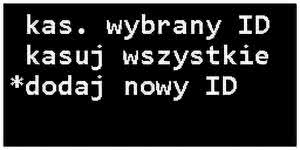 W wypadku wybrania opcji usunięcia pojedynczego ID z bazy, przy pomocy następnego ekranu i przycisku „SEL” wybieramy jeden z wyświetlanych po kolei numerów. Akceptujemy wybór przyciskiem „OK”. Sterownik poprosi wtedy o potwierdzenie decyzji o usunięciu danych z bazy. Klawiszem „OK” potwierdzamy lub naciskając klawisz „SEL” wycofujemy się z usunięcia danych z bazy. Ten ekran pokazano na rysunku 6.