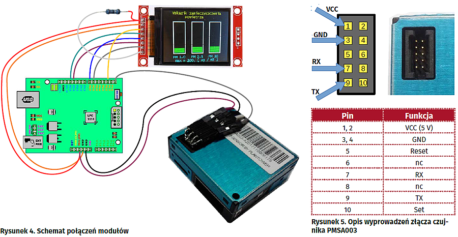 W opisywanym urządzeniu, którego schemat zamieszczono na rysunku 4, zastosowano laserowy czujnik pyłu zawieszonego o symbolu PMSA003. Czujnik wymaga zasilania napięciem 5 V, ma niewielkie wymiary, zapewnia bardzo szybką reakcję i potrafi zmierzyć stężenie w trzech zakresach: PM1,0/PM2,5/PM10. Informacje przesyłane są interfejsem UART o poziomie 3,3 V, dlatego chcąc połączyć sensor z płytką Arduino UNO należy zastosować odpowiedni konwerter napięcia. Lepszym rozwiązaniem będzie zastosowanie płytki bazowej pracującej w standardzie 3,3 V. Tu doskonałym wyborem jest płytka AVT1620 z mikrokontrolerem LPC1114.