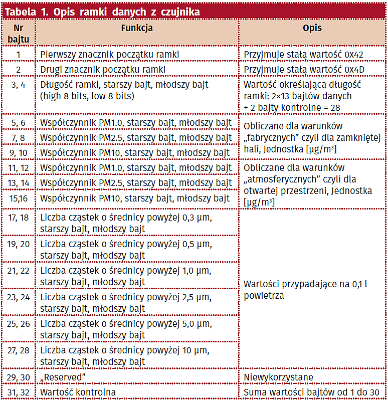 Parametry komunikacji UART to: 9600, 8, none, 1. Dane przesyłane są w postaci ramek o długości 32 bajtów. Ich znaczenie opisuje tabela 1. Z ramki można odczytać gotowe wyniki pomiaru wartości PM1,0, PM2,5 oraz PM10 policzone dla różnych warunków.