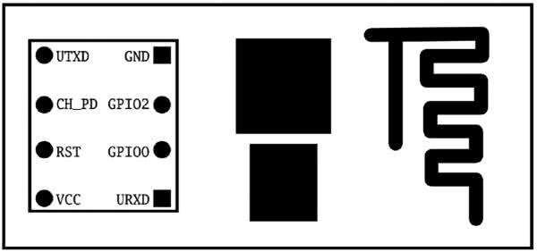 Na rysunku 1 pokazano schematyczny wygląd modułu Wi-Fi ESP01. Czarnymi prostokątami oznaczono położenie układu ESP8266 i szeregowej pamięci Flash, na prawo jest wytrawiona na płytce ścieżka anteny radiowej pracującej w paśmie 2,4 GHz. Po lewej zamontowano złącze ze wszystkimi dostępnymi sygnałami:
