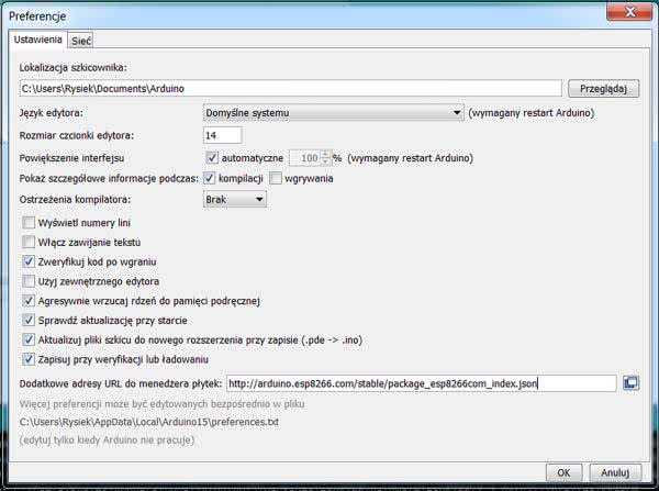 - W Arduino IDE należy podać ścieżkę do zainstalowania wymaganych bibliotek płytki ESP8266. Korzystając z menu Plik → Preferencje, w polu Dodatkowe adresy URL do menadżera płytek wpisujemy http://bit.ly/2G476lA, jak pokazano na rysunku 2.