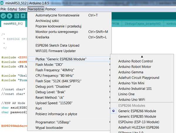 - W polach Narzędzia wybieramy płytkę modułu ESP01, jak pokazano na rysunku 3: