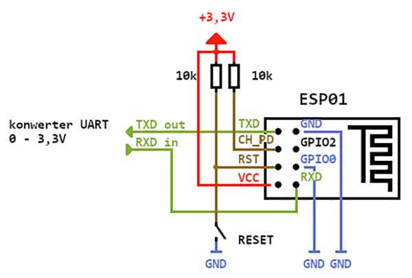 Aby moc wgrać własne oprogramowanie do pamięci Flash na płytce ESP01, jej wyprowadzenia powinny być ustawione, jak pokazano na rysunku 4. W szczególności, w momencie restartu (dołączania zasilania do modułu lub zwierania do masy wyprowadzenia RST), wyprowadzenie GPIO0 powinno być połączone z masą. Do wyprowadzeń TXD i RXD należy dołączyć konwerter UART o poziomach sygnałów 0/3,3 V.