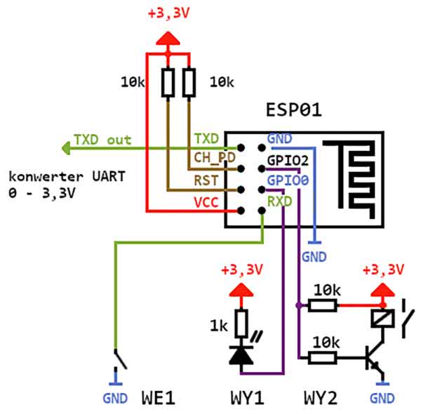 Na listingu 1 pokazano przykładowy program. W pętli badany jest stan WE1 i przepisywany na 2 wyjścia WY1, WY2. Po skompilowaniu należy zapisać program wynikowy do ESP01 w konfiguracji takiej, jak na rysunku 4. Do testowania i pracy należy połączyć wyprowadzenia ESP01 tak jak na rysunku 5. Będzie to konfiguracja mikro-serwera z obwodami wykonawczymi. Dla przykładu pokazano, jak do GPIO0, GPIO2 pracujących jako wyjścia WY1, WY2 dołączyć diodę LED i przekaźnik. Jako wejście WE1 użyto wyprowadzenia RXD.