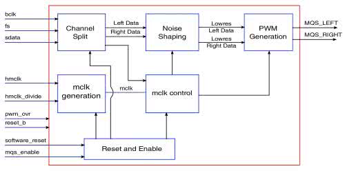 Wewnątrz procesora i.MX6ULL blok MQS jest podłączony do jednego z wyjść SAI. Nie ma więc potrzeby osobnego konfigurowania w sterowniku buforów i kolejek odtwarzania, wystarczy skonfigurować SAI tak, jak miałoby to miejsce w przypadku podłączenia zewnętrznego kodeka audio do magistrali I²S. Rejestry konfiguracyjne MQS pozwalają jedynie ustawić dzielnik zegara mclk i liczbę cykli mclk przypadającą na jeden okres PWM. W domyślnej konfiguracji częstotliwość PWM wynosi 768 kHz. Każdej próbce sygnału wejściowego o częstotliwości próbkowania równej 48 kHz odpowiada szesnaście okresów PWM.