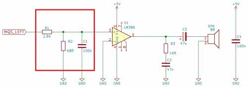 Schemat na rysunku 4 przedstawia przykładowy, prosty jednokanałowy wzmacniacz, oparty na popularnym układzie LM386 i jego referencyjnej aplikacji. Wzmacniacz pracuje ze wzmocnieniem około 20×. Dzielnik R1-R2 ogranicza amplitudę sygnału wejściowego, aby nie przesterować wejścia wzmacniacza - na wyjściach MQS występuje przebieg PWM o wartości międzyszczytowej ok. 3,3 V.