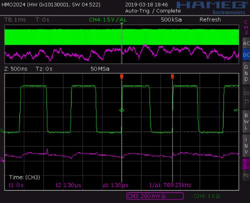 Na rysunku 5 przedstawiono zrzut ekranu z oscyloskopu w trybie ‘zoom’, który ilustruje przebiegi: