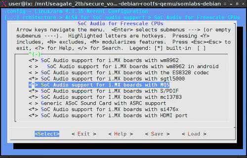 Jądro Linuxa, które jest w obrazie karty pamięci, zawiera już sterownik dla MQS. Nie ma więc konieczności jego ponownej kompilacji. Jeżeli dysponujemy własnym obrazem systemu i kompilowaliśmy jądro samodzielnie, wówczas warto upewnić się, że opcja SND_SOC_IMX_MQS jest aktywna [=y].