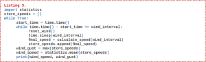 Teraz pozostało jedynie sprawdzać co ustalony czas wartość licznika i wyliczać na podstawie tego prędkość wiatru. Karta katalogowa anemometru podaje, że jeden impuls na sekundę oznacza wiatr wiejący z prędkością 2,4 km/h. Uśrednianie prędkości wiatru w dużych odstępach czasu nie jest jednak najlepszym pomysłem - zupełnie ignoruje to szybsze podmuchy wiatru - nie wieje on jednostajnie. Dlatego też dodać można skrypt obliczający nie tylko średnią, ale też maksymalną prędkość wiatru w danym okresie. Do skryptu z listingu 2 dopisujemy zawartość listingu 3.