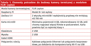 Autorzy użyli pierwszej generacji komputerka Raspberry Pi - wersji B+, do budowy opisanego urządzenia. Jednak każda inna wersja Raspberry będzie odpowiednia do tej kamery i napisanego oprogramowania, wymagając jedynie minimalnych poprawek. Wszystkie elementy składowe zebrano w tabeli 1.