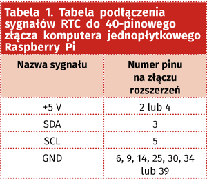 Scalony zegar czasu rzeczywistego wymaga podłączenia zaledwie kilku dodatkowych elementów, aby móc poprawnie działać. Najważniejsze to oscylator kwarcowy o częstotliwości oscylacji równej 32,768 Hz (to dokładnie 215 Hz) oraz bateria, która podtrzymywać będzie pracę zegara w czasie, gdy odłączone od modułu jest zasilanie. Schemat przykładowego modułu pokazany jest na rysunku 1. Linie SDA, SCL oraz zasilanie (+5 V) i masę podłączamy do 40-pinowego złącza rozszerzeń Raspberry Pi, zgodnie z odpowiednimi sygnałami, jak opisano w tabeli 1.